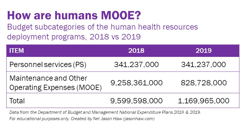 Personnel services (PS) remained the same between 2018 and 2019, and the cuts are isolated in the maintenance and other operating expenses (MOOE). Since this is a program that largely involves salaries to health professionals, why is the MOOE share much larger? This is because most allied health professionals like nurses are not counted as personnel. They are counted as contractual employees or job orders, or more commonly known as “endo.” Last May, the President signed Executive Order 51, effectively ending the practice of “endo” in all government agencies. This means that government agencies must either provide security of tenure to previously contractual staff or refuse to hire contractual employees again. The DOH took the latter approach, citing concerns about the civil service eligibility of most allied health professionals. This was mentioned explicitly by Health Secretary Francisco Duque III during the DOH budget interpellations at the House last September 3. DOH is now proposing a compromise solution, where these health professionals will still be considered contractual employees but will be provided government-mandated benefits so that their line item now becomes PS instead of MOOE.